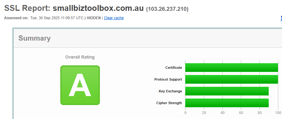 • If your grade is lower, or if the tool says you don’t have SSL installed, speak with your web developer or hosting provider. Most reputable hosts now provide free SSL certificates (often via Let’s Encrypt).