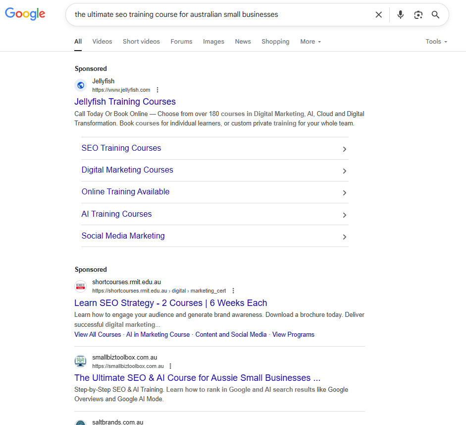 If your site is optimised, you’re more likely to be featured in these AI results — giving you exposure in places your competitors may not even be looking yet.